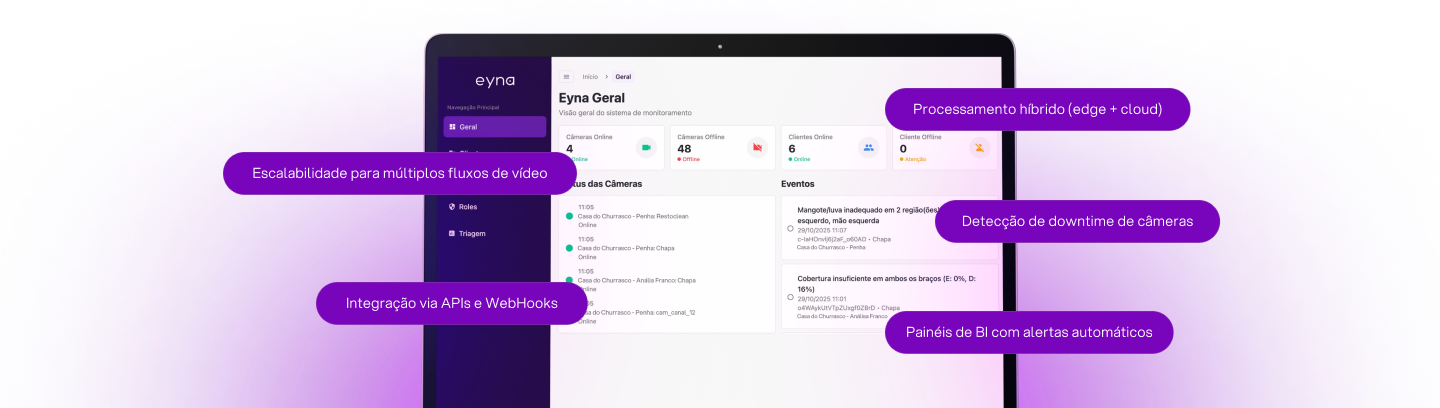 A tecnologia Eyna processa vídeos em tempo real, identifica não conformidades e envia alertas automáticos, mantendo operações críticas ativas mesmo offline e conectadas aos sistemas corporativos por meio de APIs.